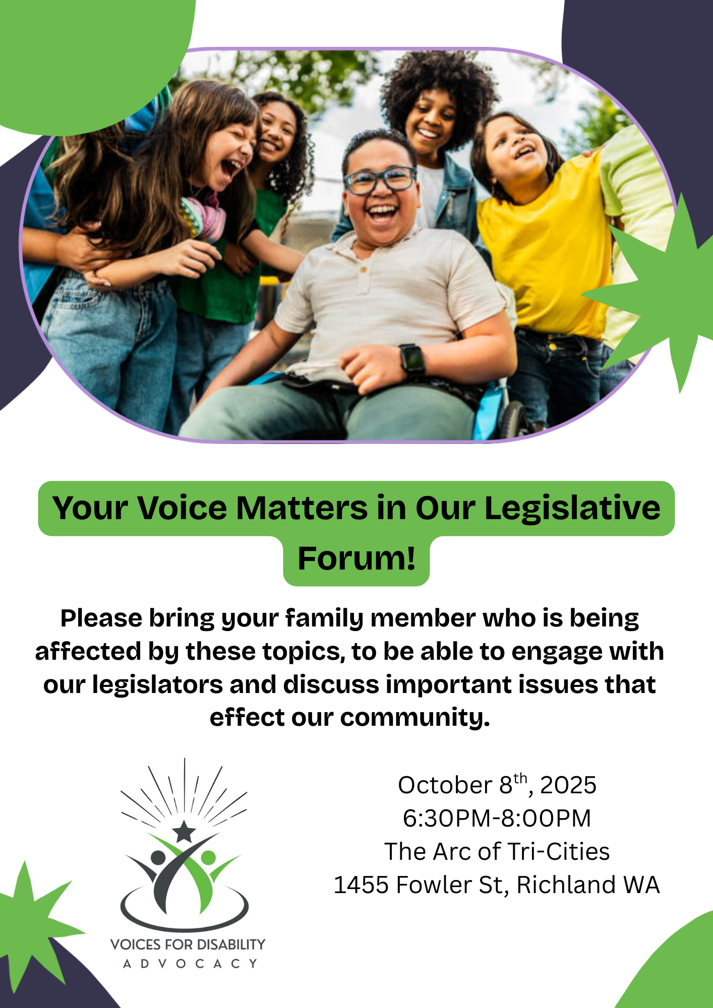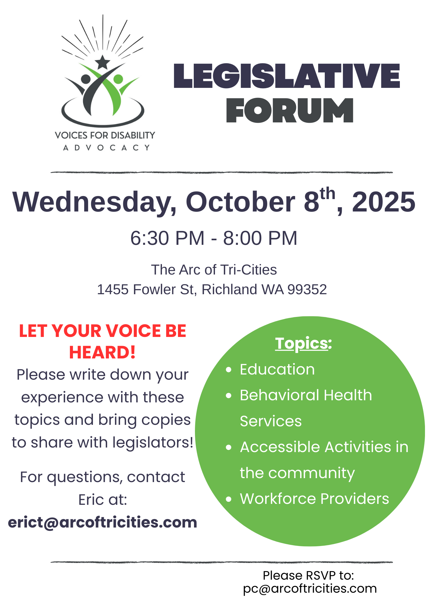 The Arc of Tri-Cities is hosting our annual Legislative Forum on October 8th at 6:30 PM. This is an important and exciting opportunity to meet your legislators and help them understand the issues that affect our families. By attending, you'll help be a part of real change in our community.