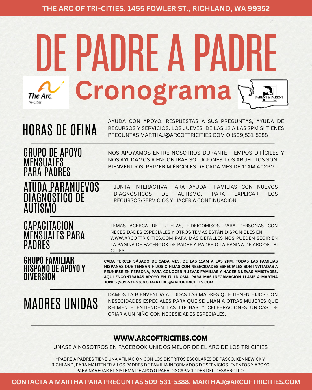 See our Current Parent to Parent Schedule below and follow our Parent and Family Calendar for details. (Tab up top)