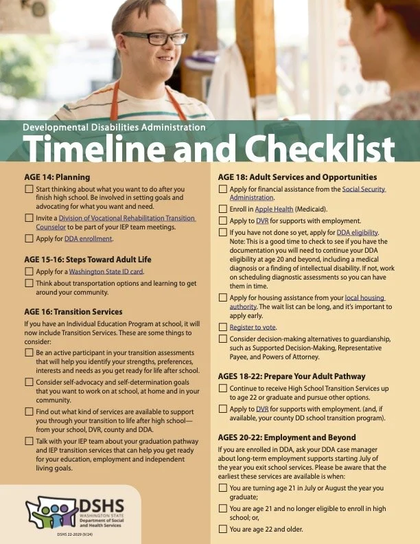 Transition Planning Timeline: What to Do and When, a Printable Timeline and a checklist of skills, activities, and services to consider when creating your child’s high school transition plan for their IEP. Click here for Ages 14-21 High School Transition Program Info.